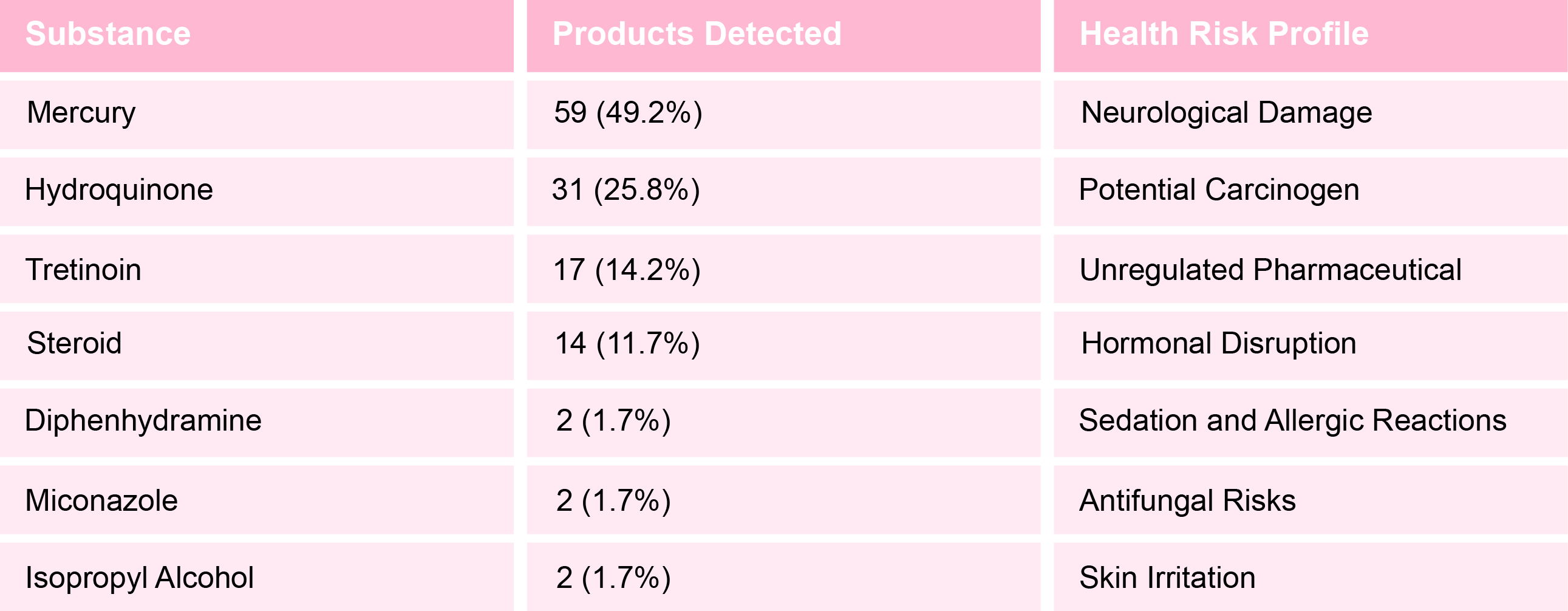 The most alarming substance detected is mercury, present in 59 products (49.2%). Commonly marketed in "skin whitening" products, mercury poses severe health risks, including neurological damage, kidney failure, and
