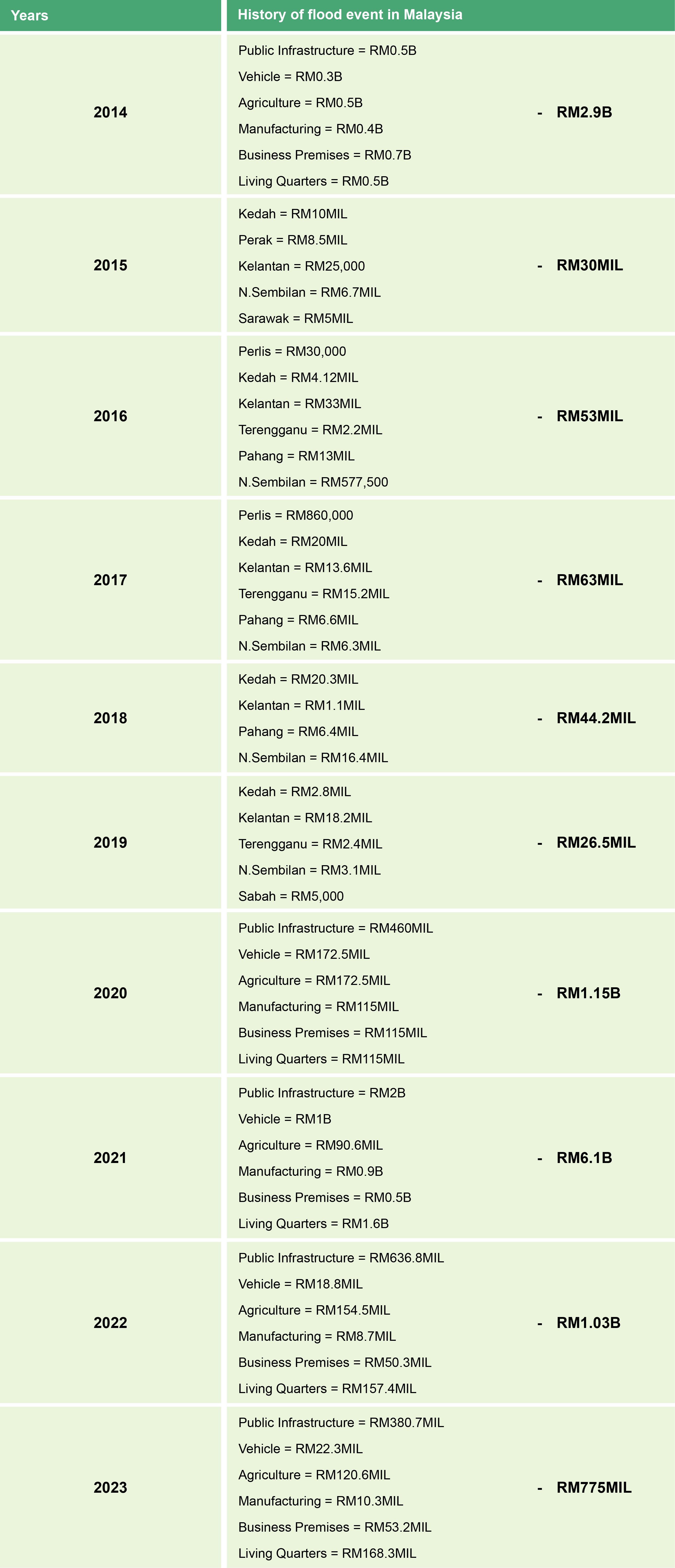 In total since 2014 until 2023, estimated loss during flood in Malaysia are RM 14 billion. The biggest loss due to flooding occurred in 2021, with an estimated loss is RM 6.1 billion. In that year, the most affected